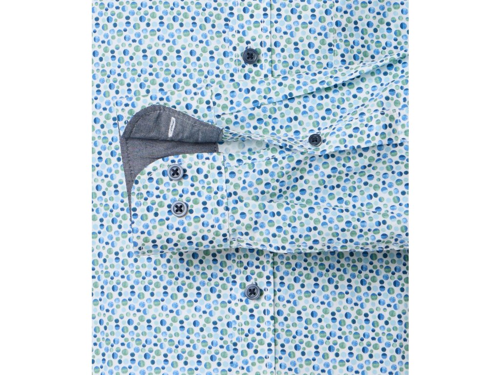 Košile s drobným modro-bílým puntíkem.