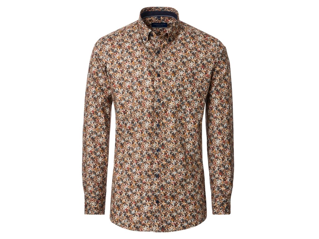 Košile se vzorem rostlin, v oranžových odstínech. Košile vypadá skvěle.