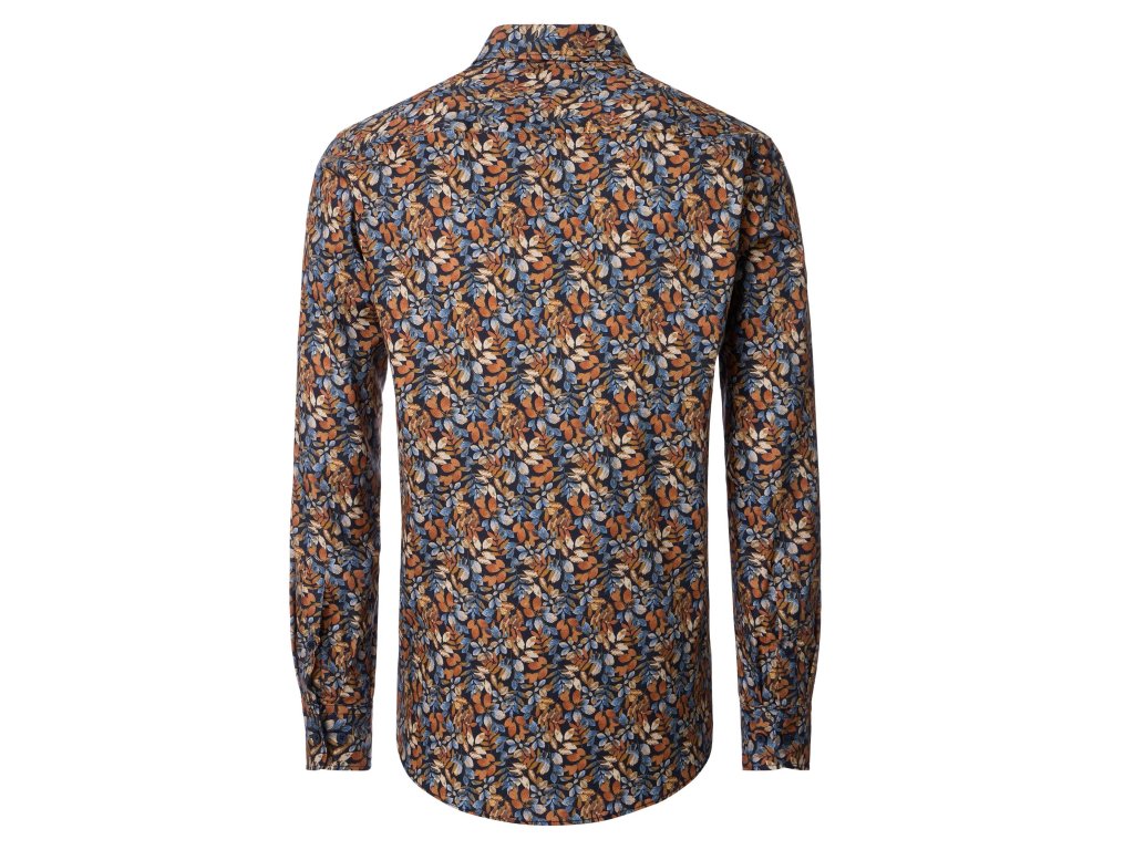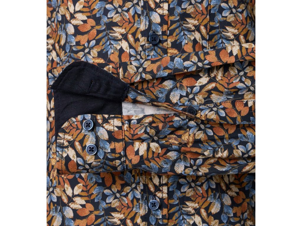 Košile v hezky sladěných podzimních barvách, tmavý podklad a modro/hnědý odstín listů.