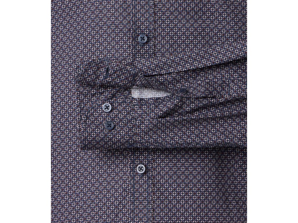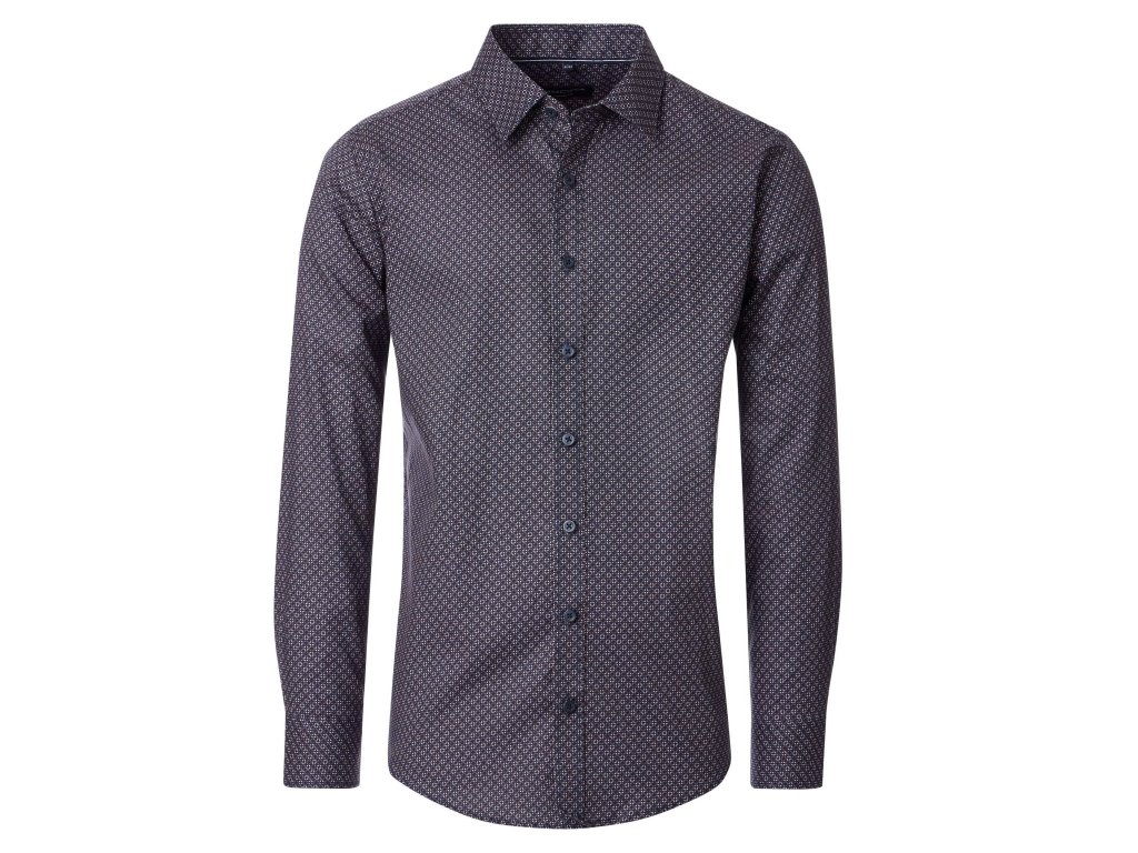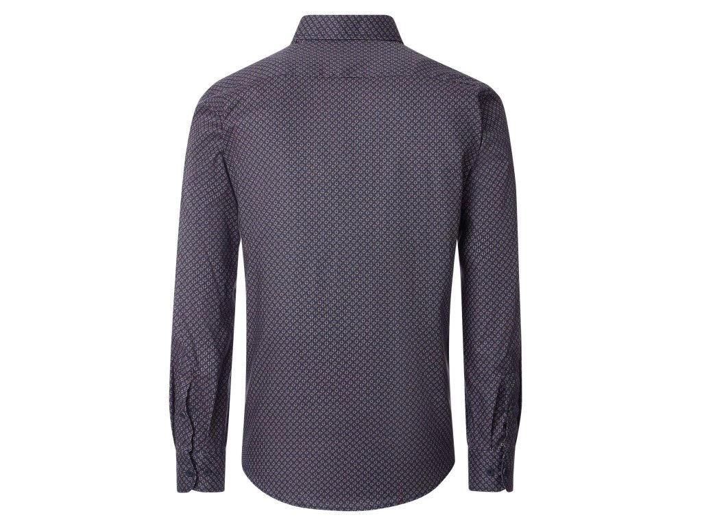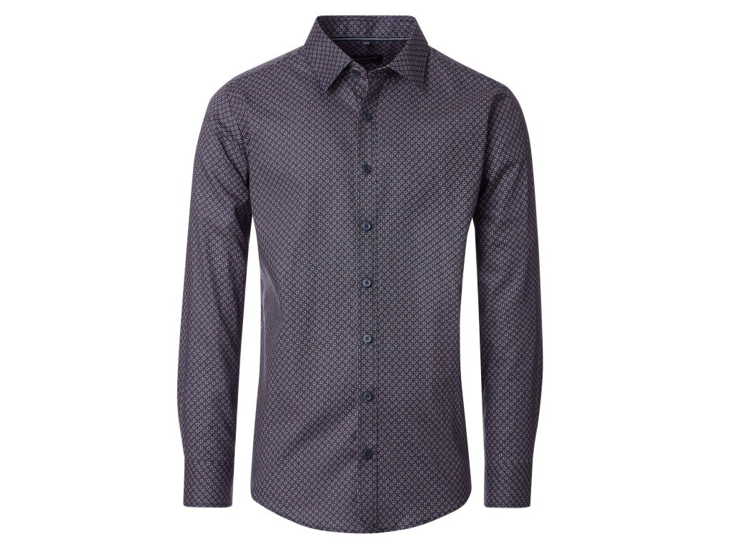 Košile je v modré barvě, s nádechem do fialova, Je se vzorečkem.