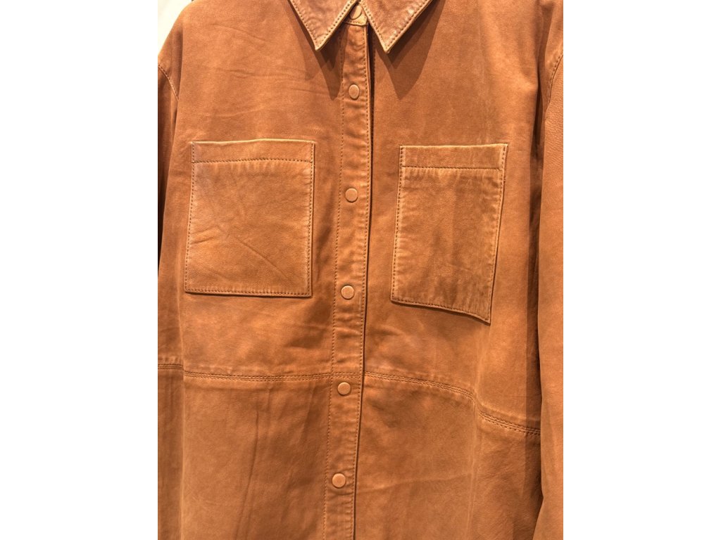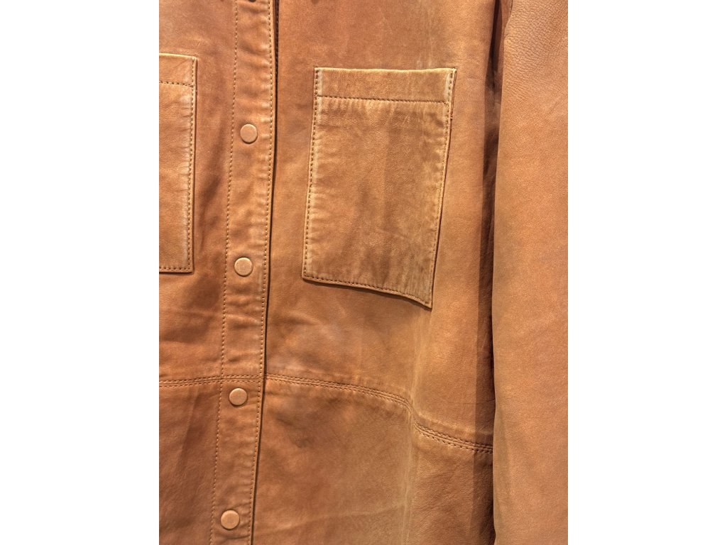 Dámská delší kožená bunda Mustang v hnědé barvě, zapínání na druky. Bunda je lehká, lze nosit právě jako bundičku na jaře, nebo i na podzim, ale také jako košili. Bunda košilového střihu a tipu.