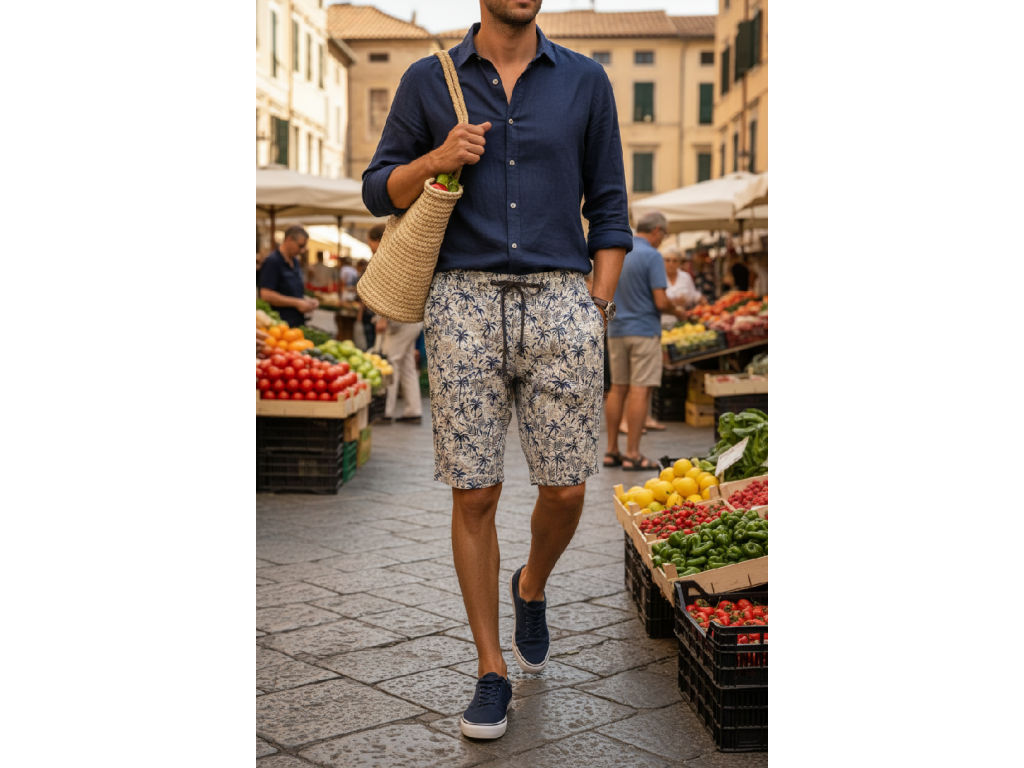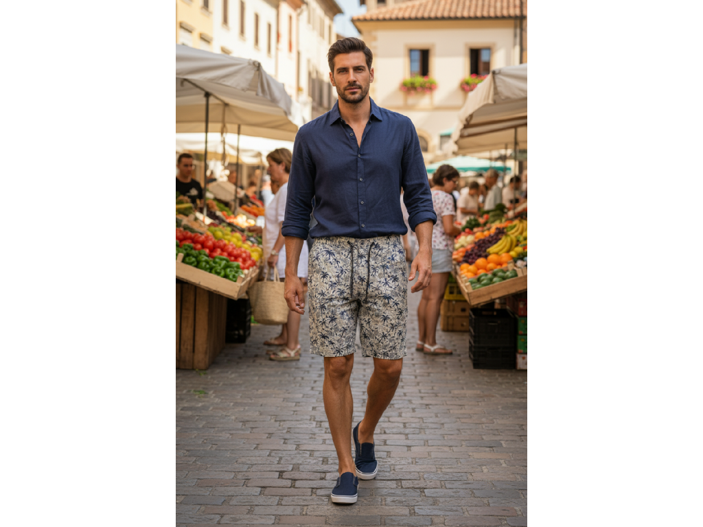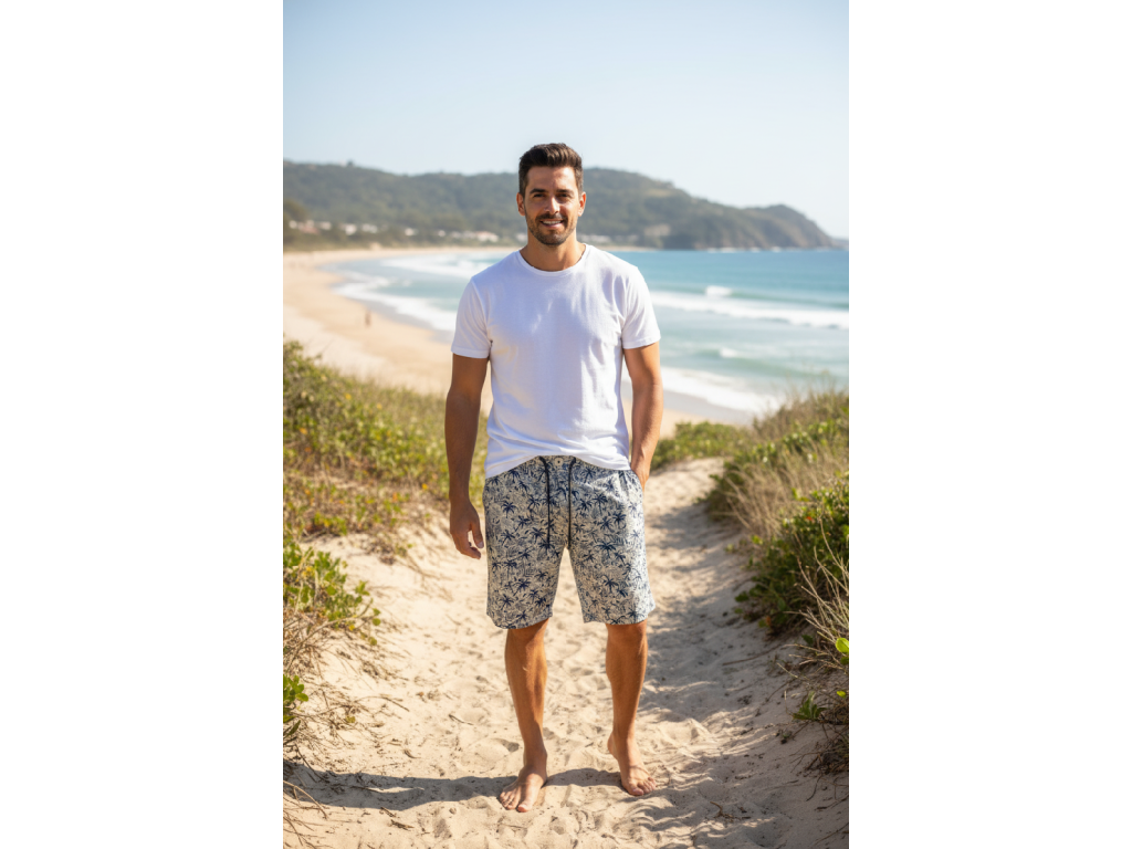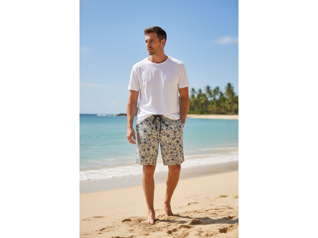 Šedo-béžová barva se vzorem palem ... vypadají naprosto skvěle. Stylový kousek do vašeho letního šatníku pánové .... ať už k tričku, nebo k lněné košili, vždy budete vypadat super.