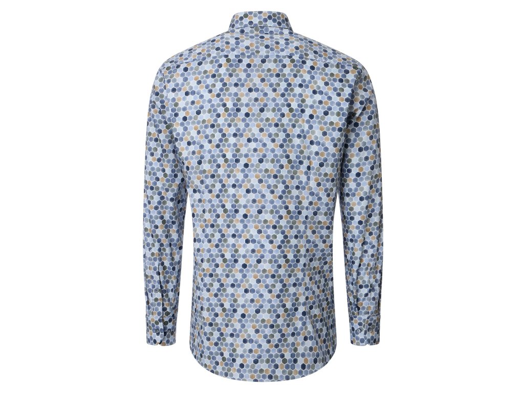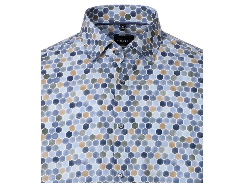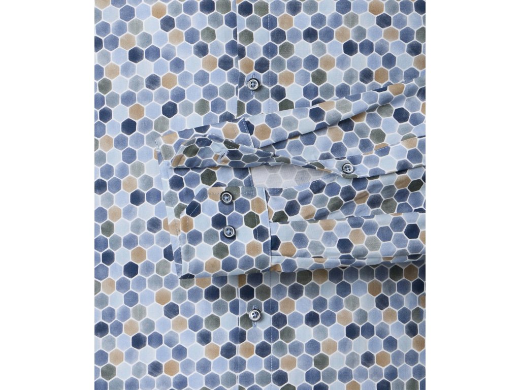 Košile v modrých barvách s detailem v zelené a béžové, geometrické tvary.