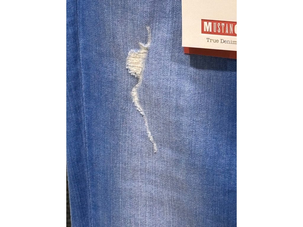 Tyto džíny mají jasně modrou barvu s náznakem trhání na nohavicích.