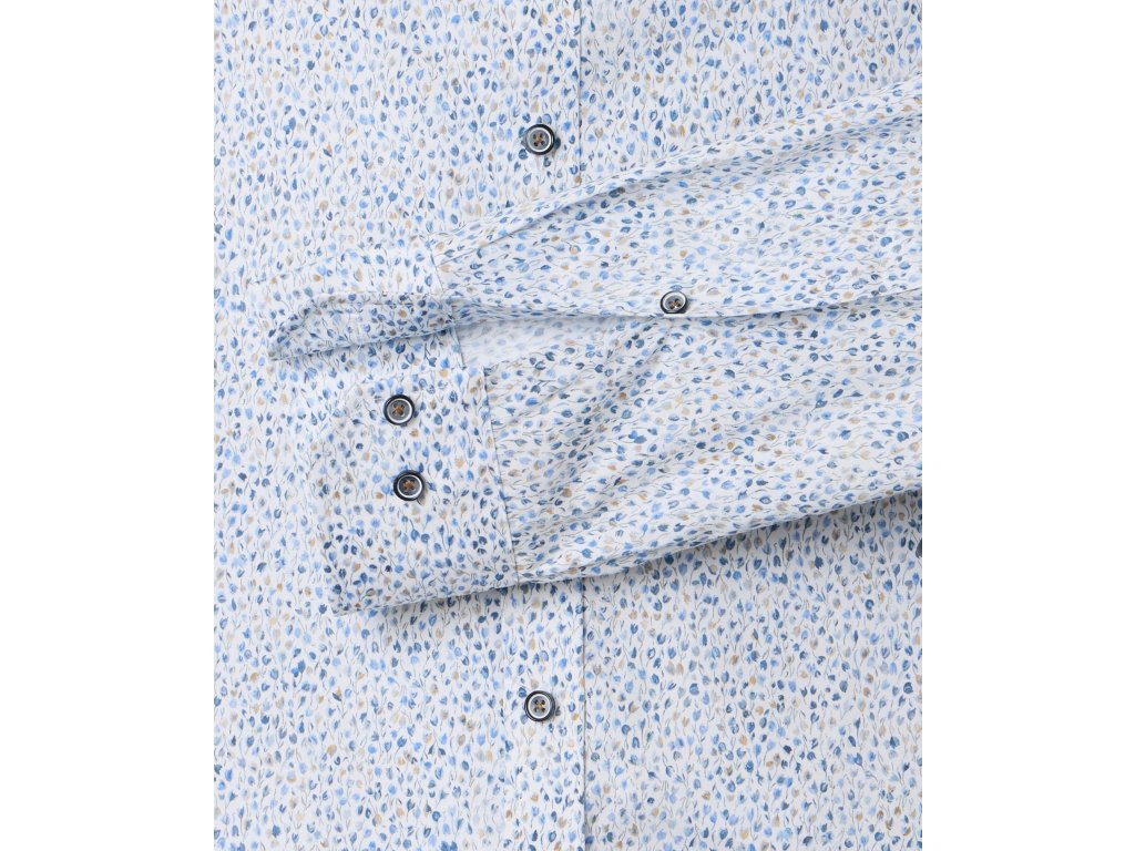 Košile je bílá a má jemný vzorek.