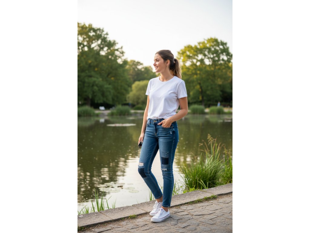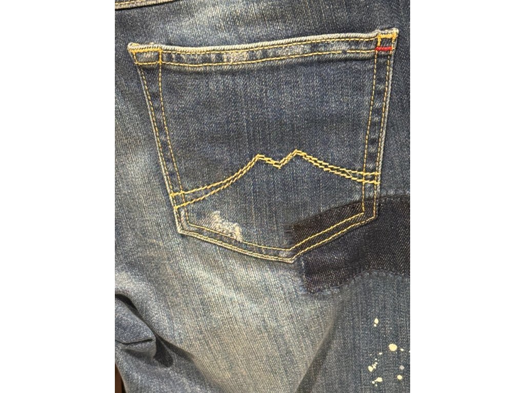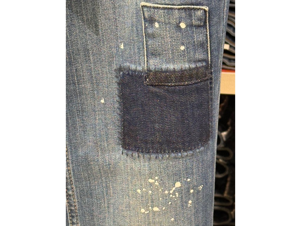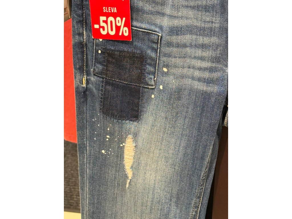 Džíny jsou středně modré barvy s výrazným designem. Mají záplaty, trhání a bílé jakoby fleky od barvy - stylové a moderní.